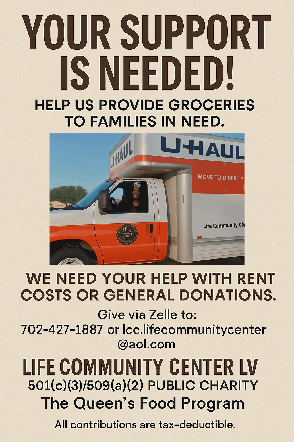 At Life Community Center LV, we rely on the hearts and hands of compassionate volunteers who believe in making a difference. Whether you're looking to give back to your community or fulfill work-related community service hours, we welcome your support in helping us serve hundreds of local families every month through The Queen’s Food Program. Volunteers must be 18 years or older, and we especially encourage those involved in court-ordered, job-related, or school-based service programs to join us. From food distribution and setup to outreach and organizing, your time and energy can directly impact lives in a meaningful way. Come be a part of something bigger — because together, we feed with dignity, love, and purpose.